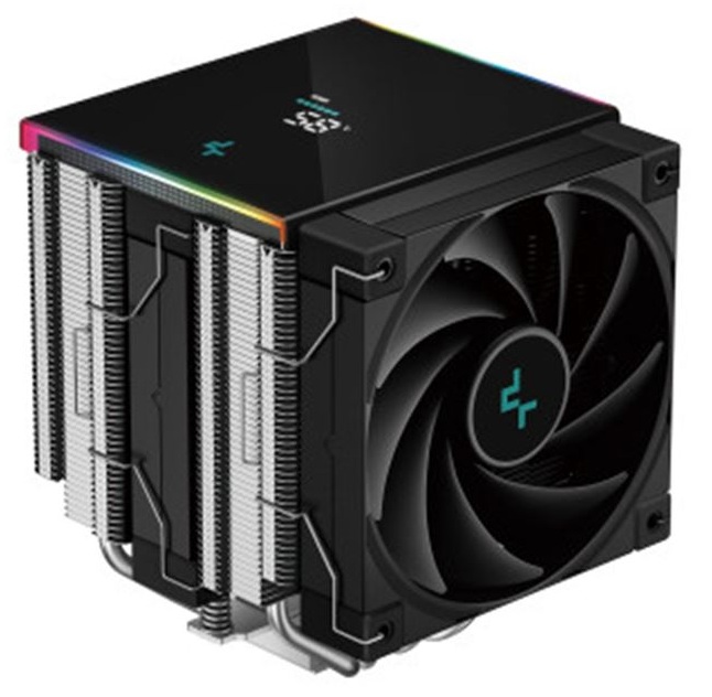 DeepCool AK620 Digital è un dissipatore ad aria ad alte prestazioni con architettura a doppia torre e sei heatpipe in rame da Ø6 mm. La cover superiore integra un display digitale che mostra in tempo reale temperatura e carico della CPU, per un controllo immediato del sistema senza software invasivi.