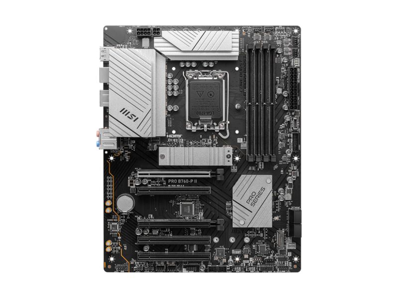 MSI PRO B760-P II. Produttore processore: Intel, Presa per processore: LGA 1700, Processori compatibili: Intel® Celeron®, Intel® Core™ i3, Intel® Core™ i5, Intel® Core™ i7, Intel® Pentium® Gold. Tipi di memoria supportati: DDR5-SDRAM, RAM massima supportata: 256 GB, tipo di slot di memoria: DIMM. Interfacce dell'unità di archiviazione supportate: PCI Express 4.0, SATA III, Livelli RAID: 0, 1, 5, 10. Tipo di interfaccia Ethernet: 2.5 Gigabit Ethernet, Controller LAN: Realtek RTL8125-BG. Componente per: PC, Fattore di forma scheda madre: ATX, Famiglia di chipset per scheda madre: Intel