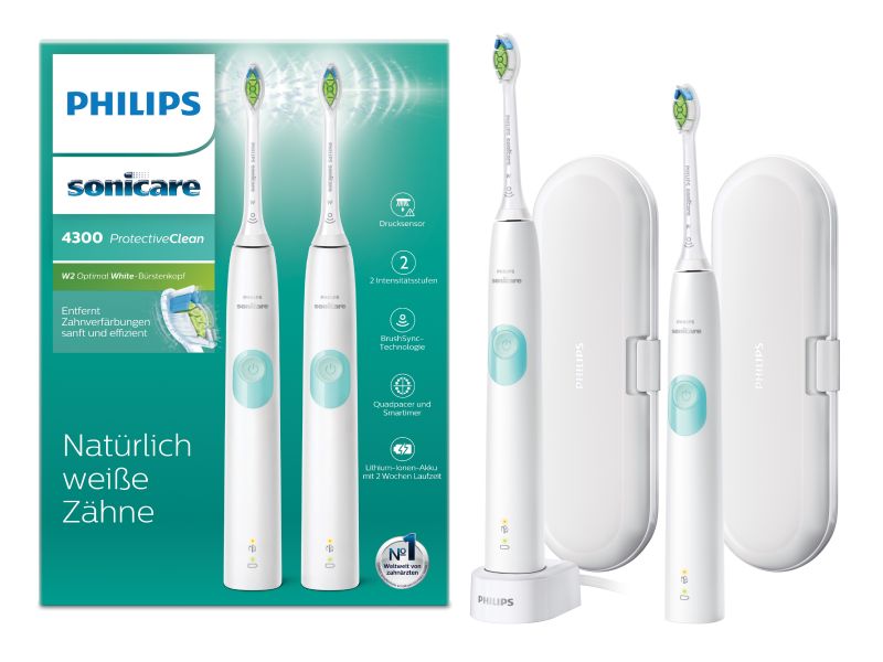 Philips Sonicare 4300 series ProtectiveClean Spazzolini Elettrici Sonici, con custodia da viaggio, confezione da 2 Spazzolini Bianchi HX6807/35