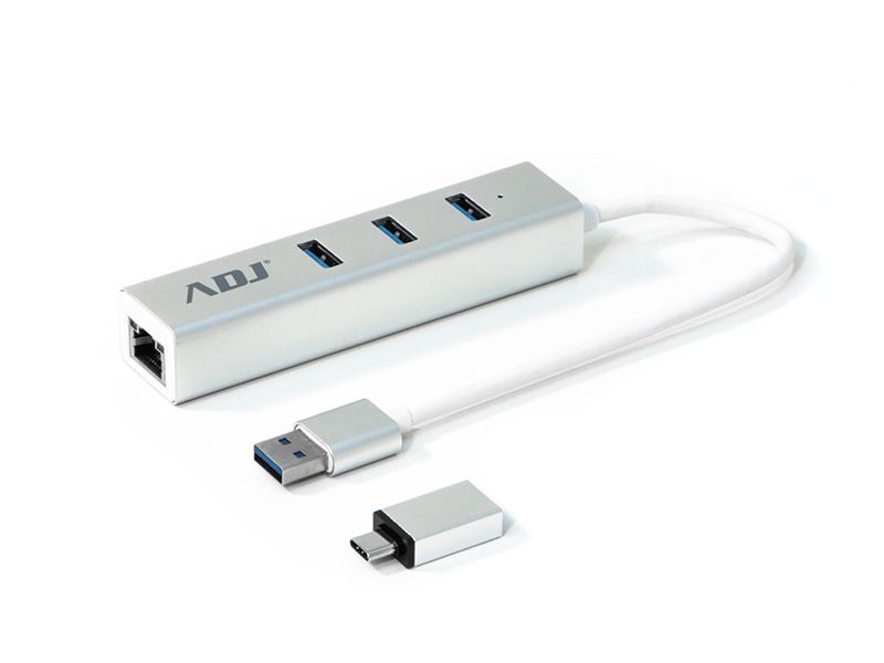 Hub HB195 Type-C / USB 3.0 Multiport ADJ - 3 Porte USB Type-A 3.0 + 1 Porta RJ45 - Con adattatore USB Type-C / USB 3.0 incluso - Colore Silver