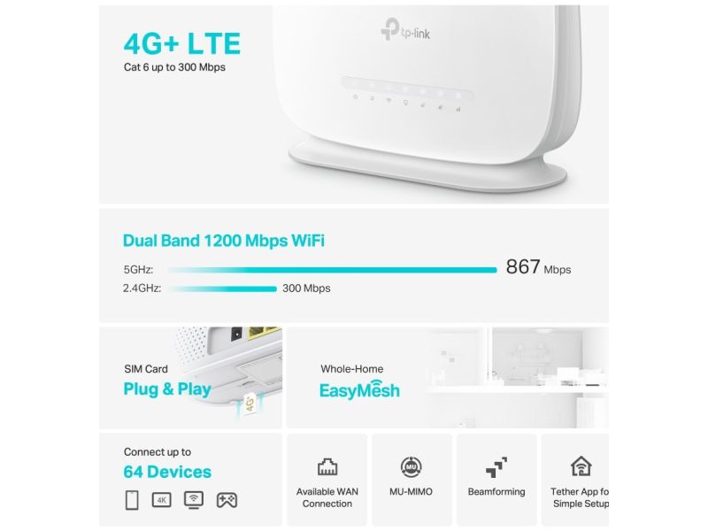 Router Tp-link AC1200 Wireless 4G+DualBand 3Porte Lan gigabit cat6 +1wan supporta wpa3