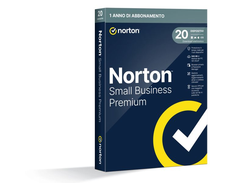 Norton Small Business Premium con spazio di backup Cloud da 500 GB per 1 Utente e 20 Dispositivi durata licenza 1 Anno