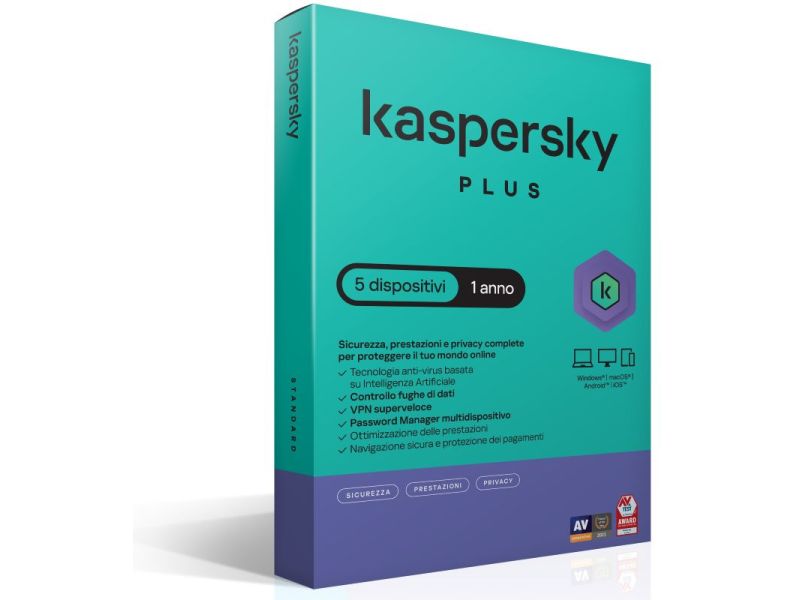 KL1042T5EFS-SSB EAN: 5056244925123 prezzo riservato 34.440 € Kaspersky Plus Sicurezza antivirus Full licenza 12 mesi per 5 device SuperSlim Box