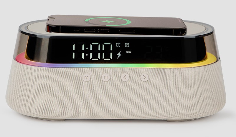 Inoltre è dotato di una power bank da 1800 mAh che permette di alimentare la lampada, orologio, sveglia e temperatura ambiente.