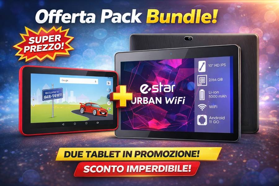 Lo Special Bundle eSTAR riunisce in un'unica confezione due tablet Android complementari: il eSTAR HERO 7" Cars Edition, pensato appositamente per i più piccoli con la sua vivace custodia in silicone morbido Disney·Pixar Cars, e il eSTAR Urban 1021W 10,1", tablet versatile per uso familiare e didattico. Una soluzione ideale per famiglie, per chi cerca un dispositivo dedicato ai bambini abbinato a un secondo schermo più grande per uso condiviso.