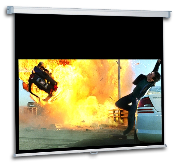 Il formato 16:9 lo rende perfetto per la visione di contenuti in alta definizione come film, video e presentazioni. I bordi neri laterali migliorano la resa visiva aumentando il contrasto dell'immagine proiettata e contribuendo a incorniciare la scena. Il sistema a molla garantisce una discesa fluida del telo e permette di bloccarlo a diverse altezze.